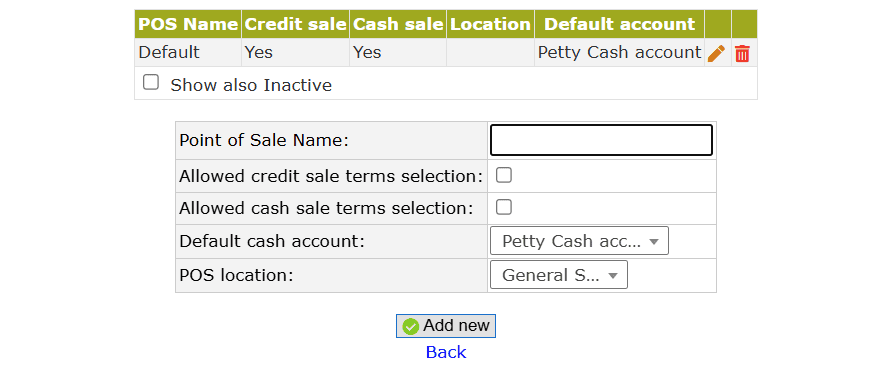 • Allowed credit sale terms selection - if set, a user with this POS assigned to can use credit sale terms when entering a sales invoice