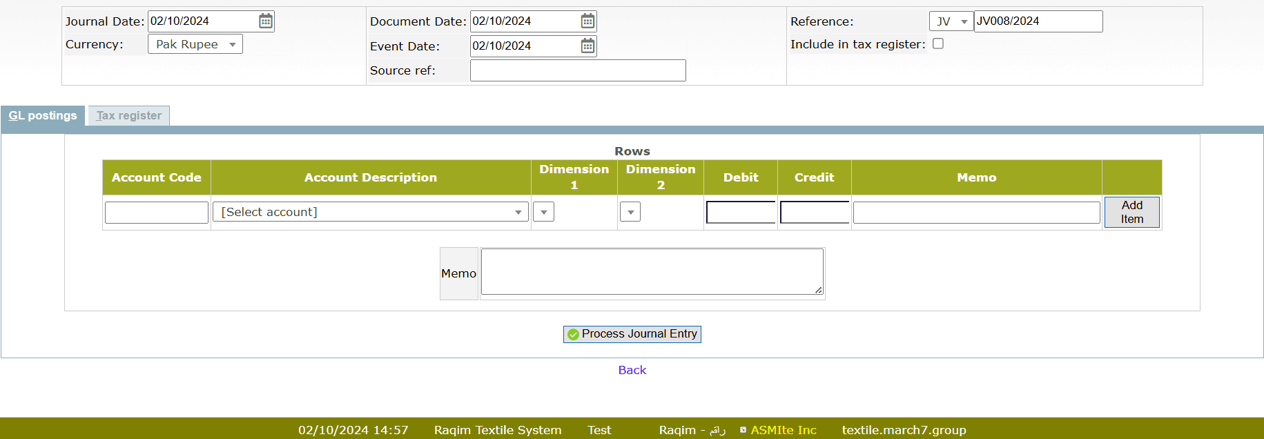 • Select date (Journal Date means the date when the entry takes effect, Document Date means the date when the document/receipt has been generated, Event Date means the date when an according event takes/took place effectively; Event Date and Journal Date often are the same).