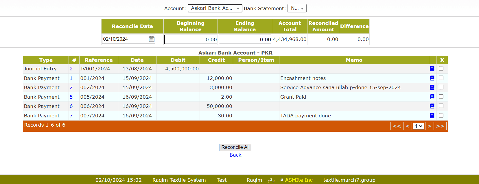 - If you want to tick most or all of the entries on the page, it is faster to click the Reconcile All button on the bottom of the page, and then untick the unneeded entries. This is especially helpful for automatically generated or imported transactions.