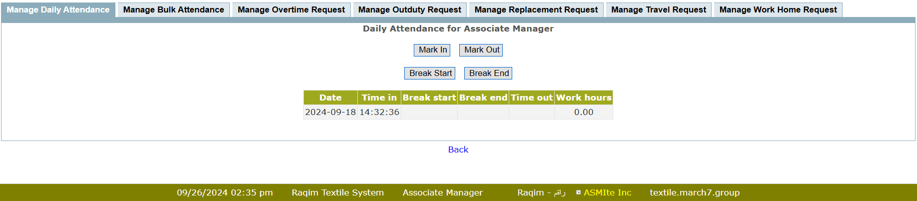 • Click Mark Out to mark Time Out of Employee Attendance