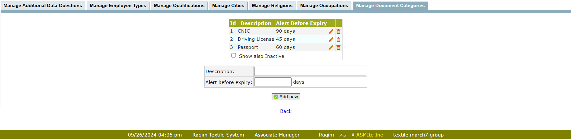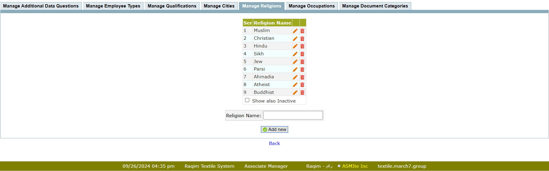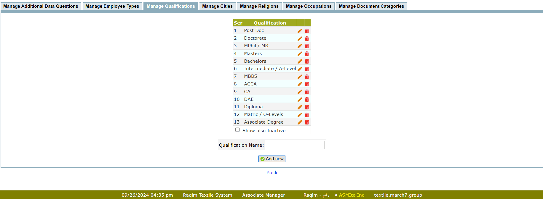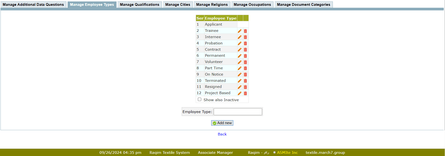 If you want disable an existing entry without deleting (which may be used in future), check the Show also Inactive box to see inactive entries and check the inactive box against the entry you want to disable.Employee Definitions are used in Employee setup in drop-down lists (Which can't be edited in the form)