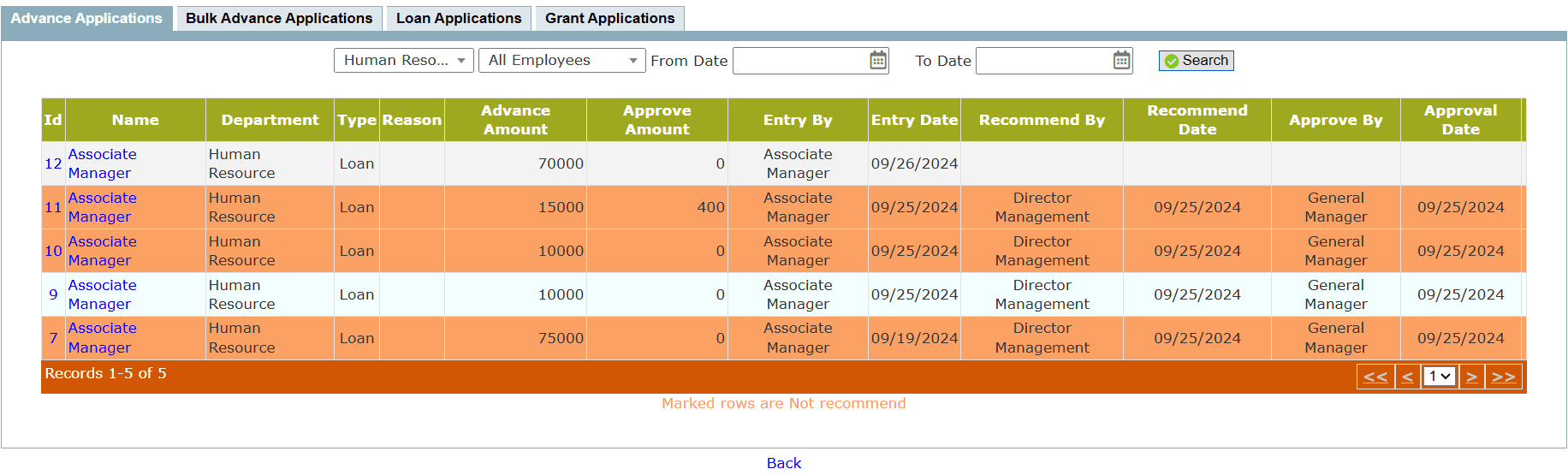 - Click the Green button to Recommend (by the supervisor of the employee) the Advance Application to the competent authority