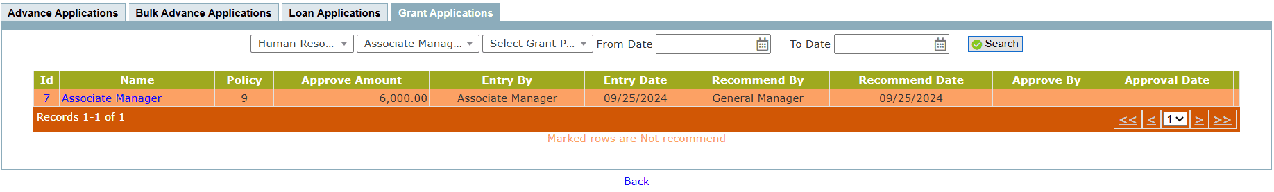 - Select Employee, Grant Policy and click Search to apply filter