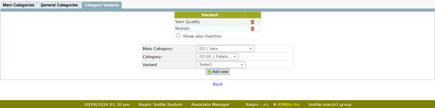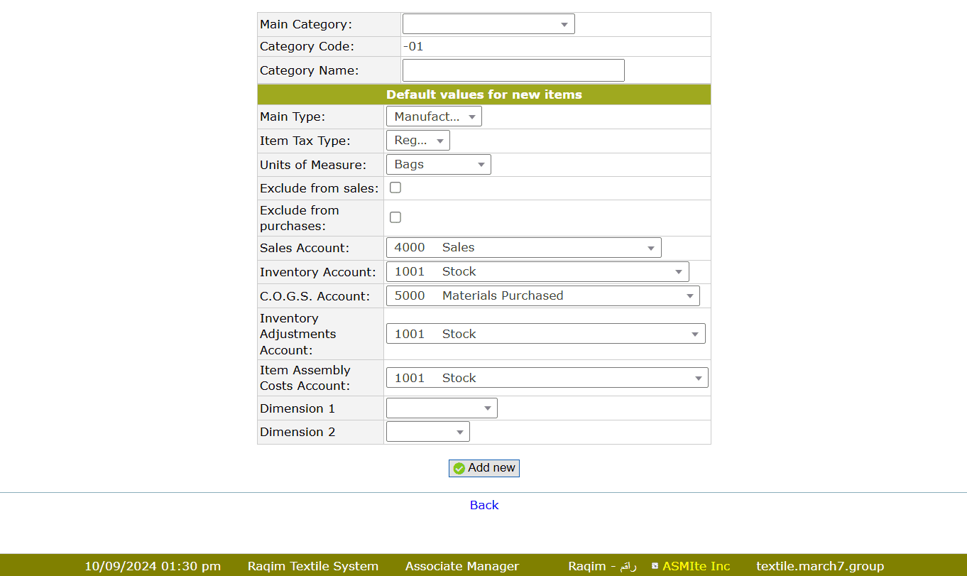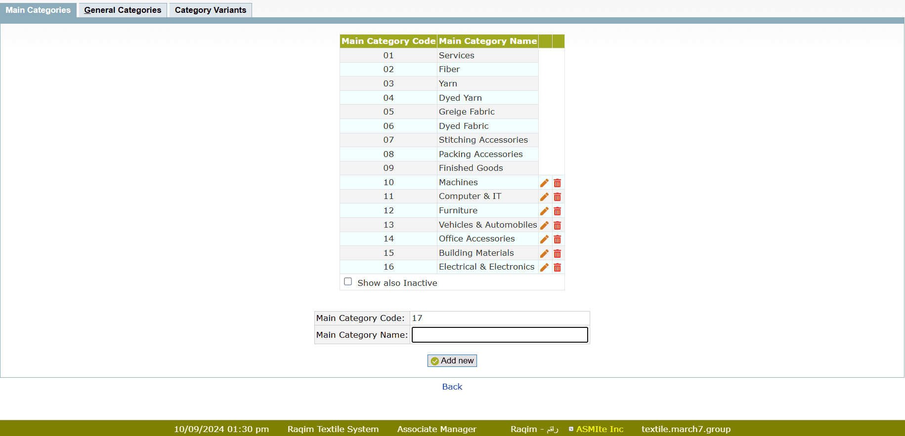 • You have to create a new Main Category (if needed), Main Category Code is alloted automatically, however, you have to enter the Main Category Name, and comments section contains the additional information of the Item Category