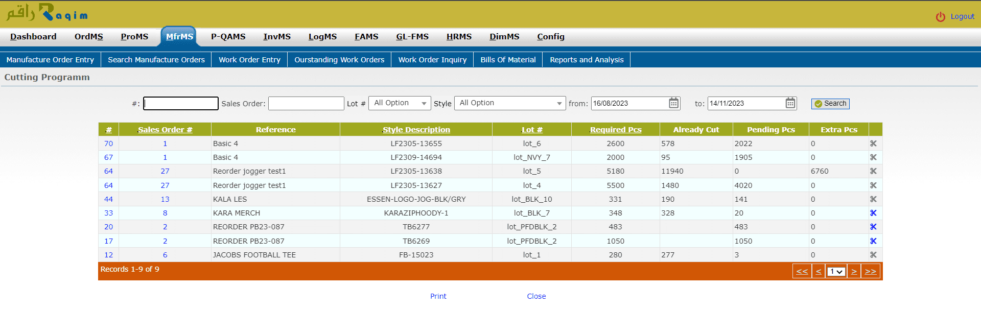 You can see the Manufacture Orders in the list and by clicking on the Cutting button next to the manufacture order, you can plan the cutting process