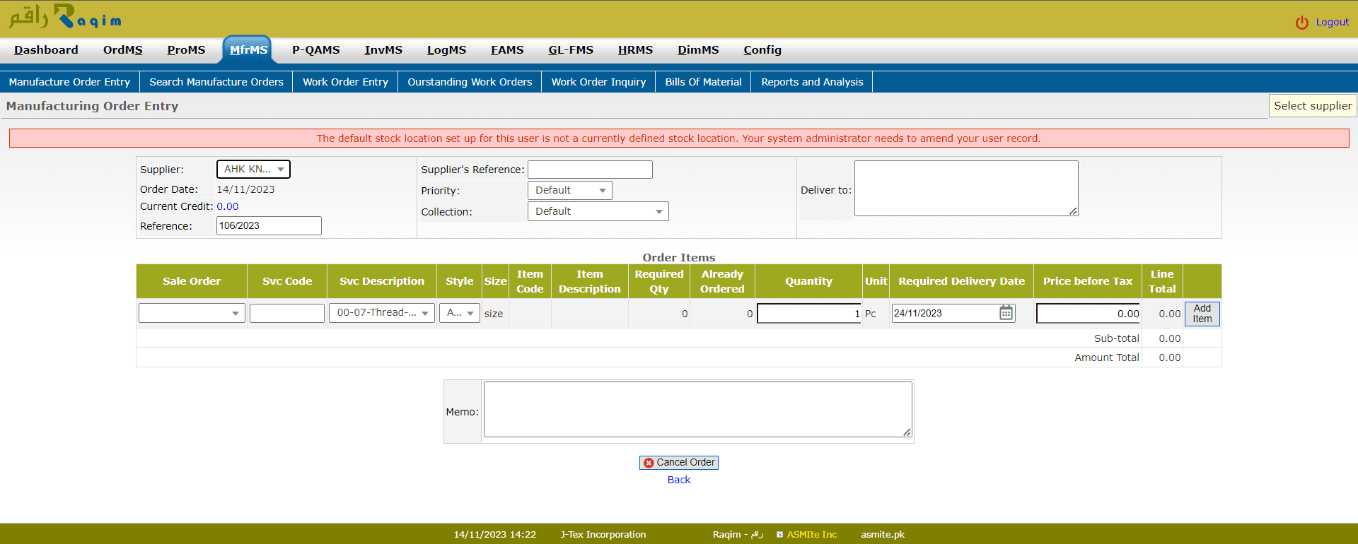 Manufacture Order Entry