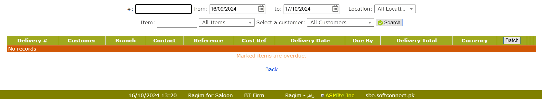 A batch invoice, a single invoice created from multiple work orders/deliveries, can be processed if all items have been sent to the same location. Click the check-box beside each delivery and click the Batch button at the top of the column to make such an invoice.