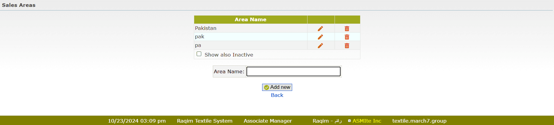 - Enter the name of the area you wish to add under Area Name input field and click Add new.