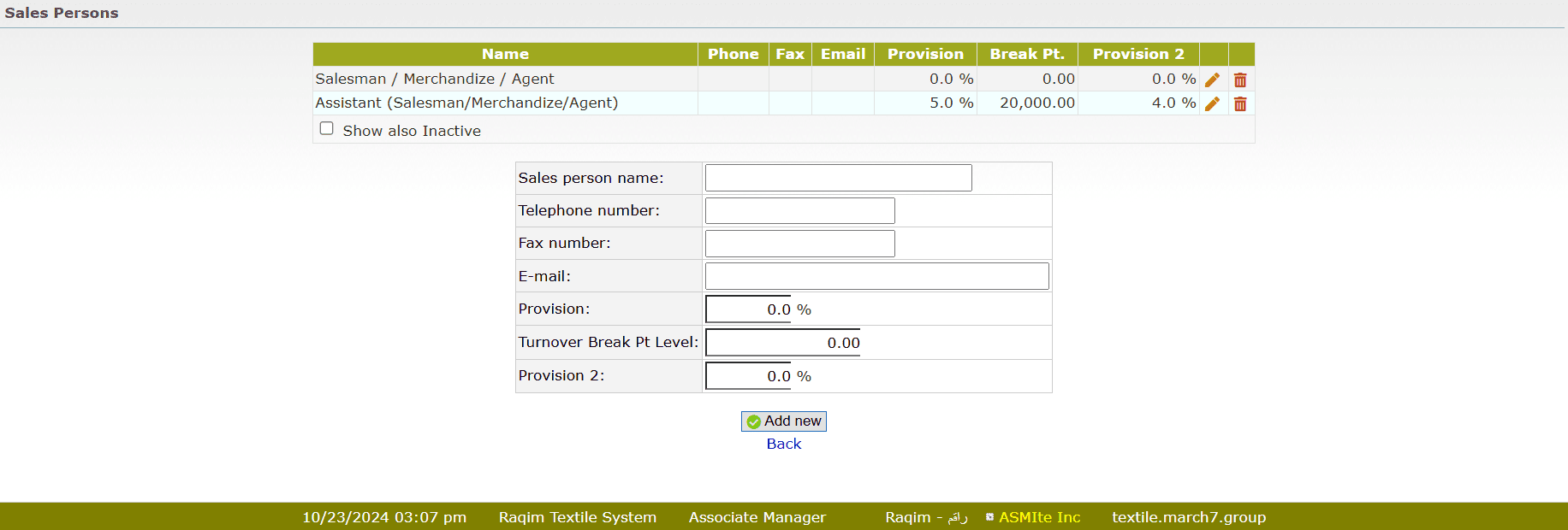 Here you can add/edit and delete your Merchandizers details. Also you can add a 2 level Provision / commission for each one of them.