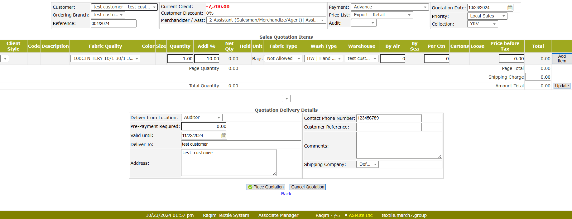 - Now create a Sales Quotation. Select customer Sales Quotation and select the newly created branch. Add the items and save.
